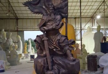 這是一尊以不銹鋼為材質(zhì)的景觀雕塑,塑造了關(guān)羽騎于馬上、手持青龍偃月刀的形象,立于巖石造型底座上,盡顯其武圣風(fēng)采與英雄氣概。